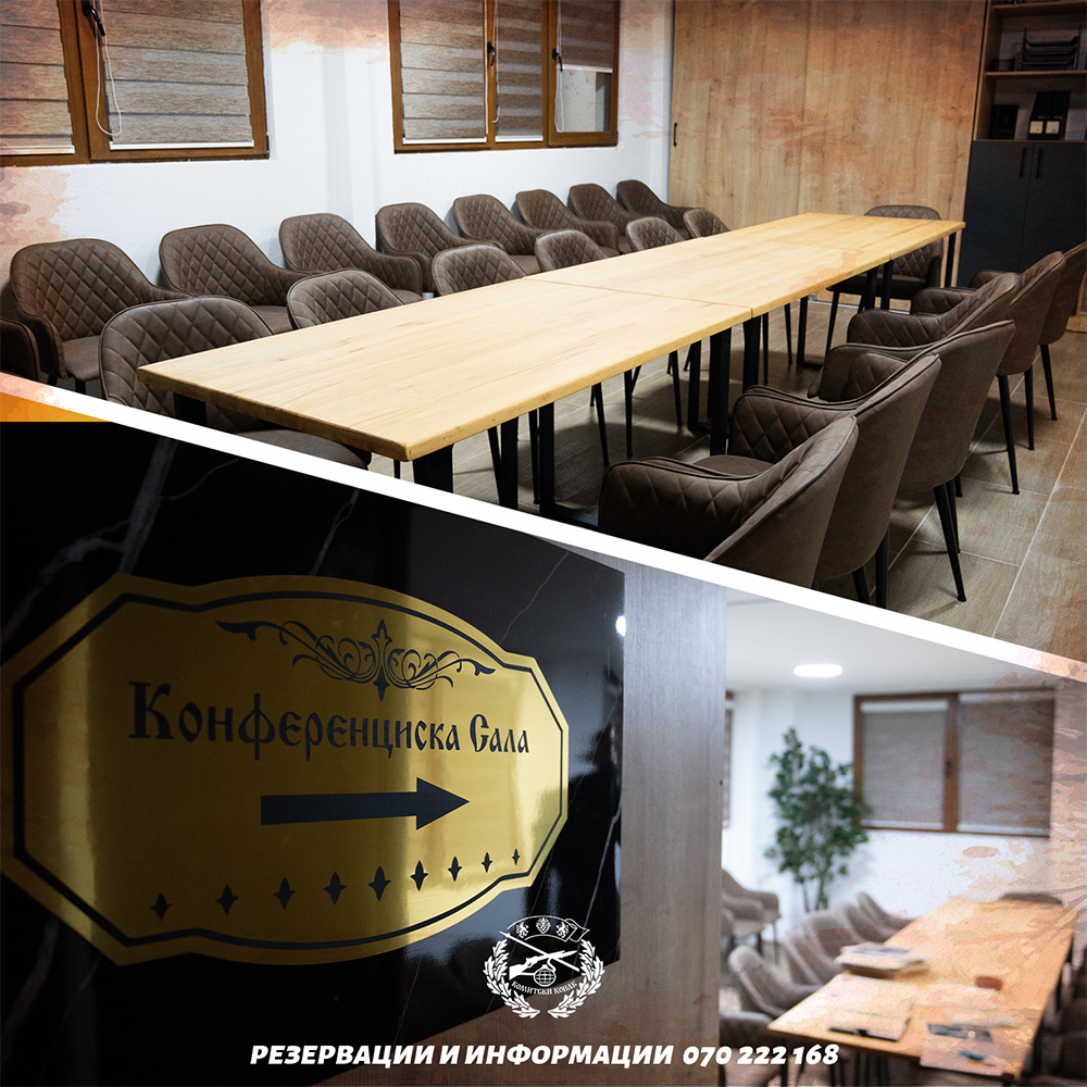 Kонференциската сала е идеална за организирање состаноци, семинари, тим билдинг, работилници и други настани. Салата е пространа, удобна и опремена со сè што е потребно за успешна реализација на Вашиот настан.